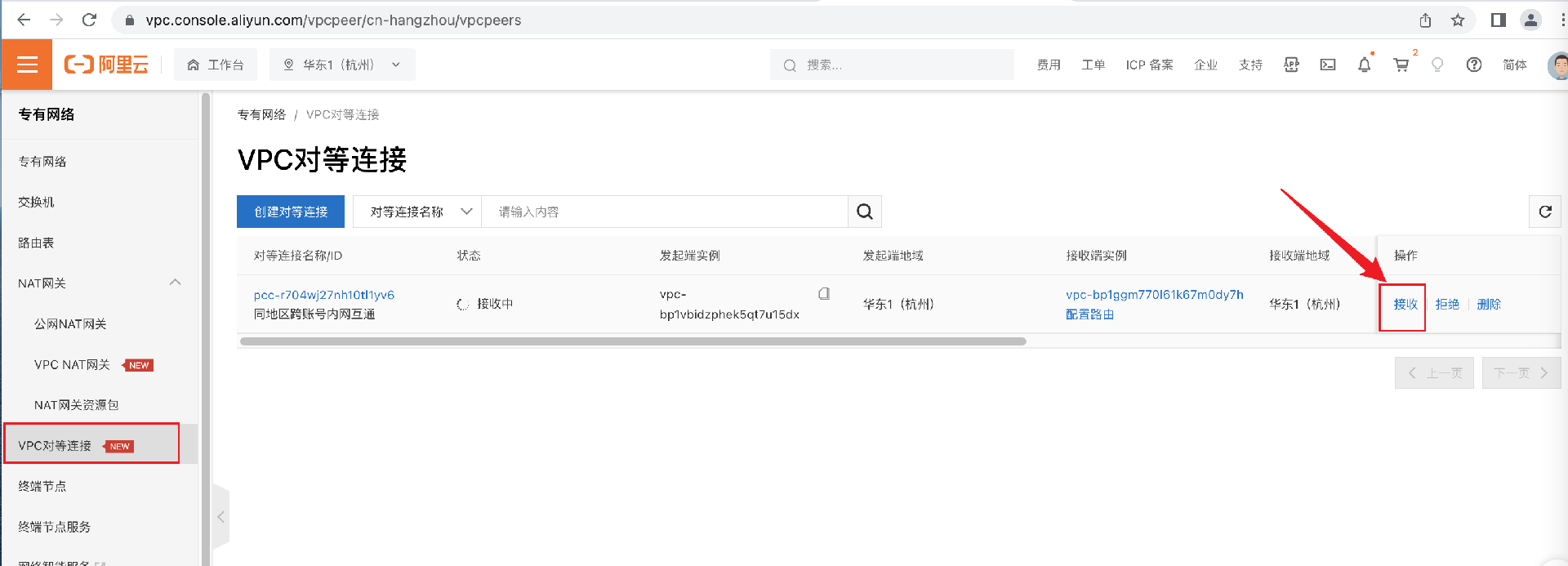 7、接收VPC对等连接请求:在操作列单击接收。